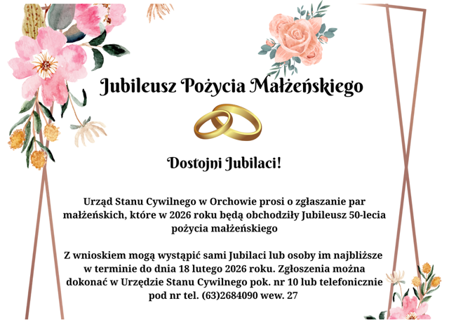 Jubileusz Pożycia Małżeńskiego. Drukuj Kopiuj link Facebook.com X.com Data publikacji: 12.01.2026 godz. 15:13 Wyświetlono: 50 Kategoria: Aktualności Tematyka: Urząd Gminy Orchowo Zobacz również Zobacz więcej 08.01.2026 Efekty działań Stowarzyszenia „Unia Nadwarciańska”... 08.01.2026 Stawki podatkowe obowiązujące w roku 2026 w gminie... 09.01.2026 Ostrzeżenie meteorologiczne Nr 5 - IMGW-PIB Regionalne...